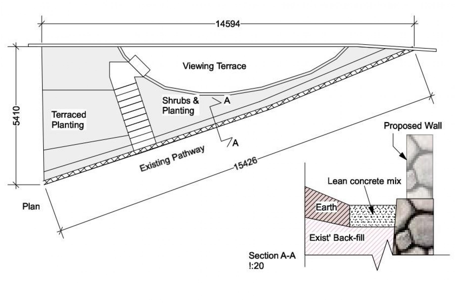 ProposalExtend an existing 3m high stone wall, which is adjacent to a public footpath, by up to 1m high. Terrace the slope for use as garden space.