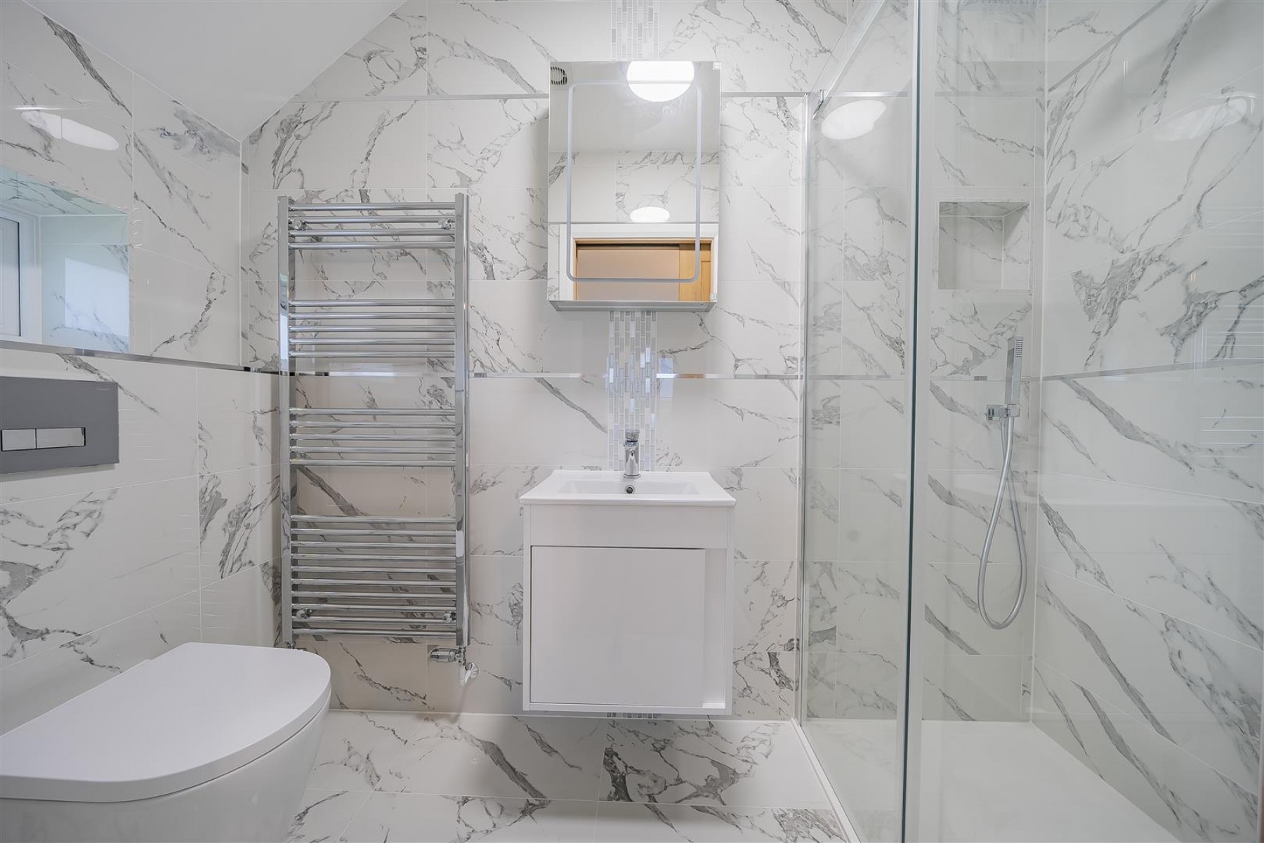 The rear ground floor comprises lounge area which spans the width of the property complete with multiple windows and French doors leading to a private courtyard. A utility area with storage and plumbing for appliances complete the accommodation on this level and provides internal access to a large garage complete with electric up and over door. To the first floor, four well balanced double bedrooms can be found, three of which prospering from integrated wardrobes. Bedroom one has the added benefit of a stunning tiled en suite bathroom. A further tiled three piece bathroom suite is also located on this level, comprising mains fed shower over bath, W.C and wash basin.