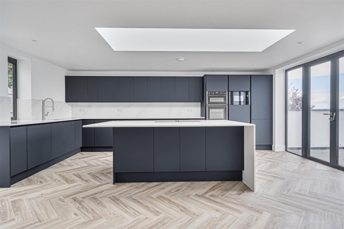On the first floor, is the impressive bright open-plan kitchen and breakfast area making the most of the far-reaching views via its glazed façade. The well-appointed kitchen has been carefully considered to suit everyday family needs and sociable entertaining. Honed white granite waterfall worktops sit atop a plentiful provision of simple midnight blue cabinetry and high-end appliances. Adjacent is a vast reception room with French doors opening onto two spacious balconies, perfect for all fresco dining or entertaining. Completing the first-floor layout is the utility room, with banks of full-height cupboards and room for washing and ironing, the fifth bedroom and WC. A spiral staircase accessed from the side balcony via bifold doors leads to the private garden planted with small hedging softening the parking and garden edges, and trees, as well as lots of aptly chosen plants.